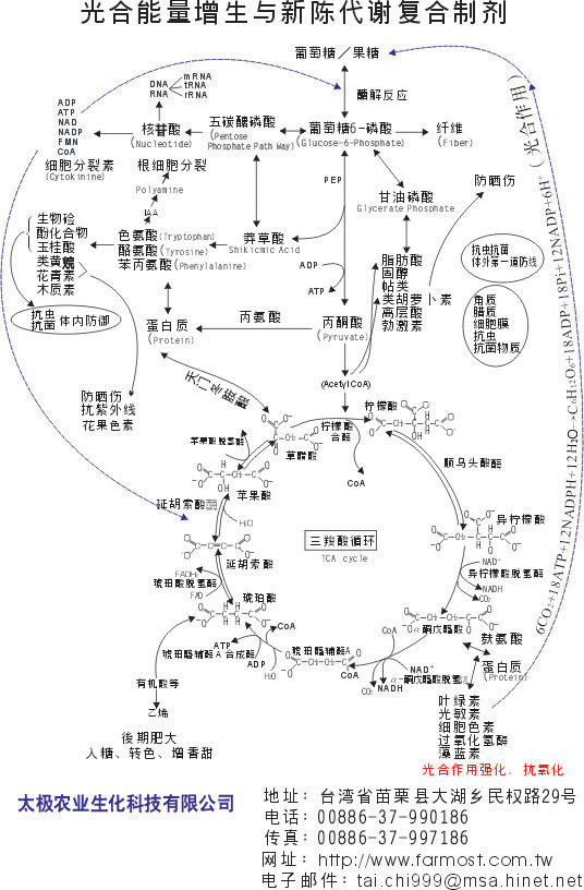 台湾太极农业生化科技有限公司是一家专业从事高科技农业生产研究和无毒无公害新高科技的植物生理代谢剂等研发的企业,针对各类农作物的生理流程研发生产了全套生化酵素、新陈代谢剂及RNA、DNA生合成促进酵素,通过使用这些无毒无公害的产品可以精确的控制所有作物的生理机能以达到预期的高产量高品质。太极公司所研发的"植物图像语言系统" 与新陈代谢剂及"植物体新陈代谢调控技术"是独步世界的高新技术,为全球首创,是中国人的骄傲。